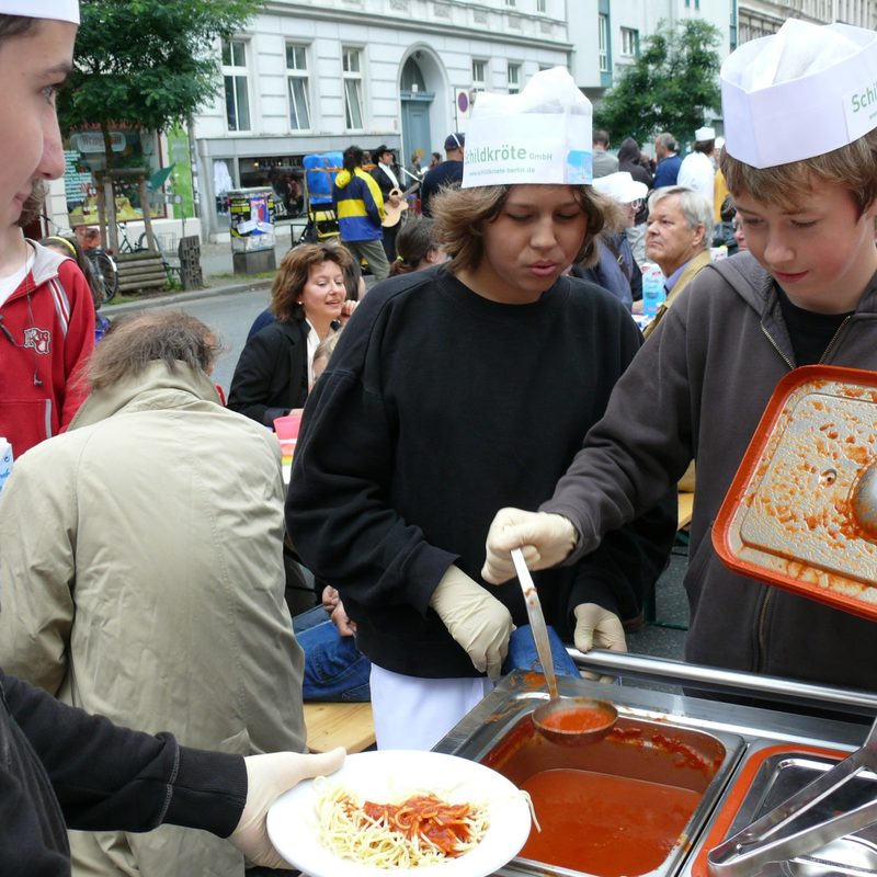Der Paritätische Wohlfahrtsverband Berlin schreibt: "Im Rahmen einer Aktion von Lange Tafel e. V. in Kooperation mit dem PARITÄTISCHEN Wohlfahrtsverband Berlin e.V. werden nach einem 5-Jahres-Stufenplan 500 zusätzliche Stellen gefordert. Schirmherrin ist Prof. Barbara John. Alle Berliner Schulen sollen einen Sozialarbeiter bekommen - dieser Forderung verleihen Lehrer, Eltern, Schüler und Sozialarbeiter von Jugendhilfeträgern am Samstag, 22.10.2011, ab 14 Uhr mit einer spektakulären Aktion Nachdruck: Sie alle essen zusammen Spaghetti an einer bis zu 120 Meter langen Tafel auf dem Alexanderplatz, nahe der Weltzeituhr. Über 20 Schulen nehmen teil."