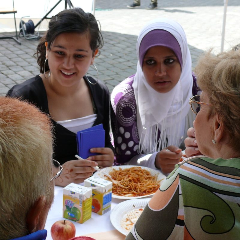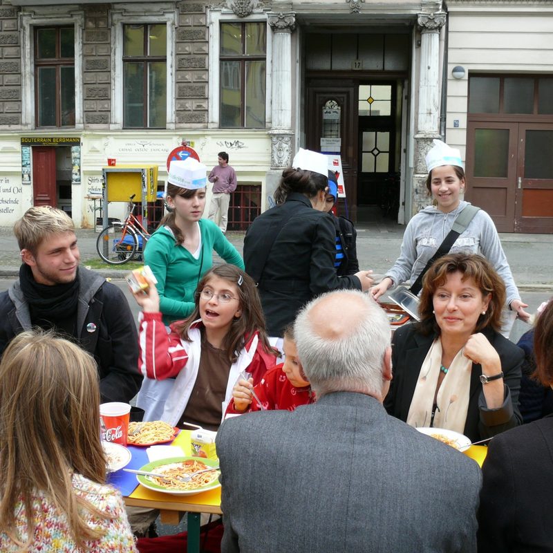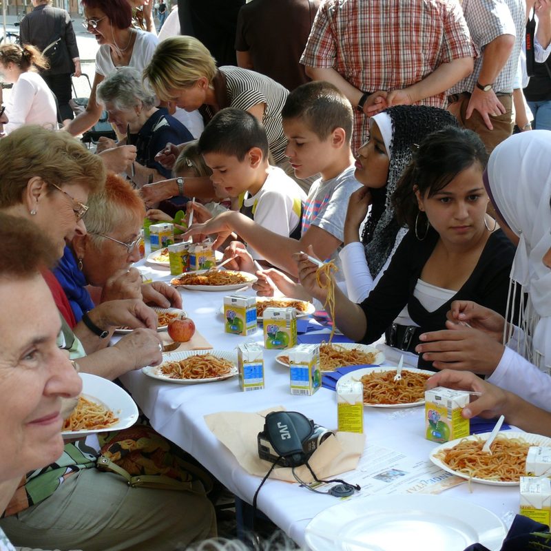 Der Tagesspiegel berichtet über die erste Lange Tafel am Gendarmenmarkt: "Die Touristen guckten verblüfft."Für einen lebendigen Dialog der Generationen ein großes inszeniertes Spaghettiessen an der längsten Spaghettitafel Berlins."