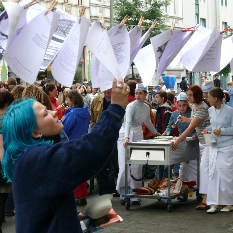 Im Format Neues Volkstheater, entwickelte die Theaterkünstlerin Isabella Mamatis mit ihren Lange Tafel Inszenierungen über Kunst und Kommunikation ein Theater, das für den Dialog der der Generationen, Religionen und Kulturen steht.
